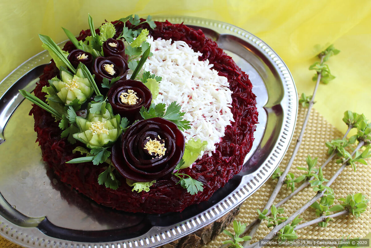 Описание приготовления Салат «Курица под шубой» можно приготовить и в повседневном, и в праздничном варианте. Блюдо вкусное, сытное, яркое. Сочетание солёных и сладких ингредиентов (маринованные огурцы и свёкла, например) даёт очень интересный результат. Вместо майонеза можно использовать сметану – это изменит вкус салата и сделает его менее калорийным. Что понадобится: Этапы готовки 1 Отварить по отдельности картофель, морковь, свёклу, яйца. Остудить, очистить, натереть на крупную тёрку. 2 Разобрать копчёную курицу: удалить косточки, мясо порвать на кусочки. 3 Зелёный лук вымыть, мелко нарезать. 4 Маринованные огурцы натереть на крупную тёрку. 5 Поставить на тарелку кольцо. Салат выкладывается слоями. Первый слой – картофель + «сетка» из майонеза. 6 Второй слой – зелёный лук + «сетка» майонеза. 7 Третий слой – копчёная курица + «сетка» майонеза. 8 Четвёртый слой – морковь, яйца + «сетка» майонеза. 9 Пятый слой – маринованные огурцы + «сетка» майонеза. 10 Шестой слой – св