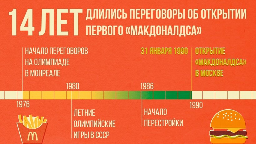 31 января 1990 года открылся первый ресторан сети Макдональдс в СССР, в этом году сети ресторанов исполнилось 30 лет на территории нашей страны. Произошло это в Москве на Пушкинской площади. Первый месяц около Макдака была огромная очередь. Не смотря на огромные для человека из Совесткого Союза цены.