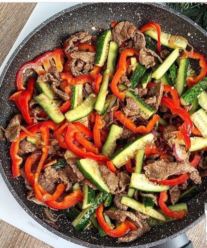 Тёплый салат по-корейски ✅КБЖУ:107.6/8.48/7.03/2.8🔸 Ингредиенты: ▫️400 гр мяса (брала вырезку говядины) ▫️3-4 шт огурцов ▫️1 луковица ▫️1 сладкий красный перец ▫️2 зуб.чеснока ▫️3 ст.л соевого соуса ▫️2 ст.л уксуса или лимонного сока ▫️2 ст.л оливкового масла ▫️1/2 ч.л красного острого перца соль Приготовление: ▫️Огурцы нарезать. Посолить, оставить на 10-15 мин. ▫️Подмороженное мясо нарезать тонкими кусочками, обжарить на сковороде до готовности, добавить лук, нарезанный полукольцами, соевый соус и готовить до мягкости лука. После этого огонь выключаем. ▫️Огурцы отжать от сока, добавить острый перец, чеснок через пресс. Огурцы и сладкий перец добавить к мясу, влить уксус/лимонный сок, масло, перемешать.Дать настояться мин 15 и можно подавать ПП рецепты🍏 |