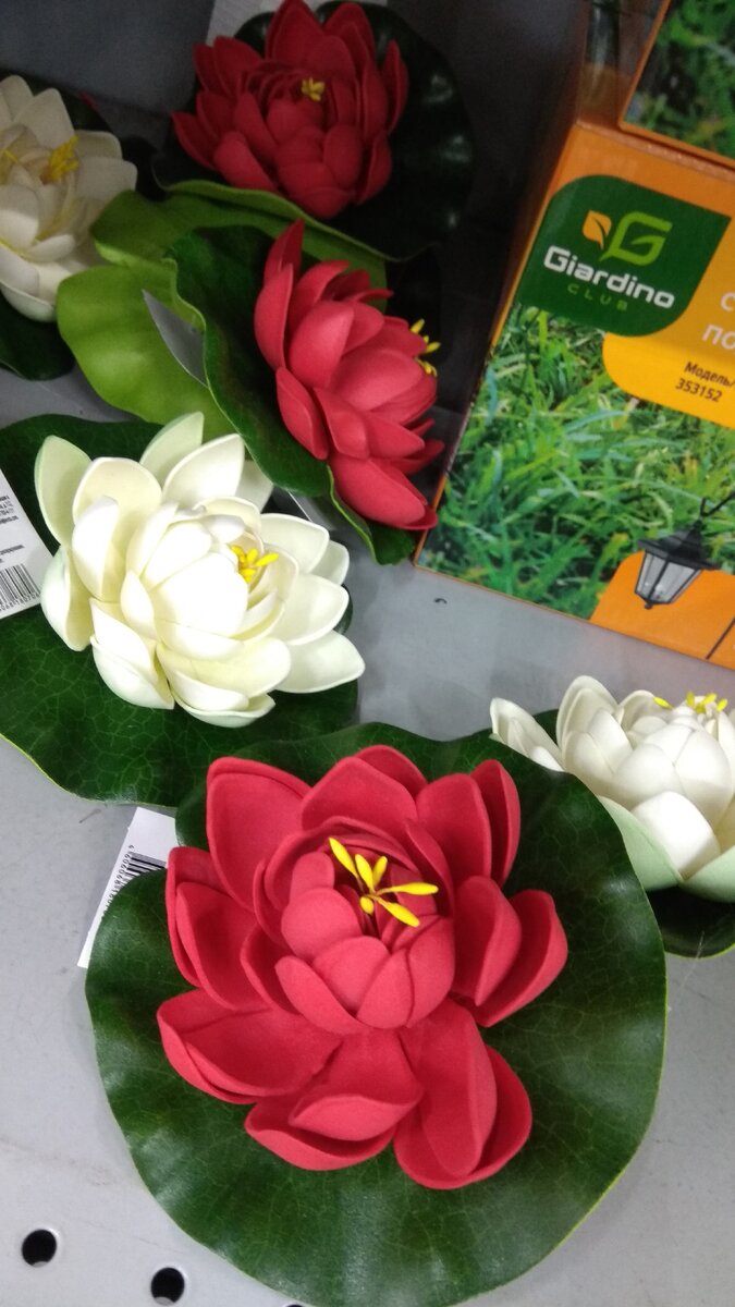 Очень красивые кувшинки. Цена - 49 руб. 99 коп. Выглядят реалистично, красочные, сочные цвета. Наверное, водоем только выиграет, если в нем появятся такие цветы. Кому как, а мне сразу захотелось и черепаху Тортиллу туда пристроить, и мостик, а на нем Буратино) Сказка - одним словом.