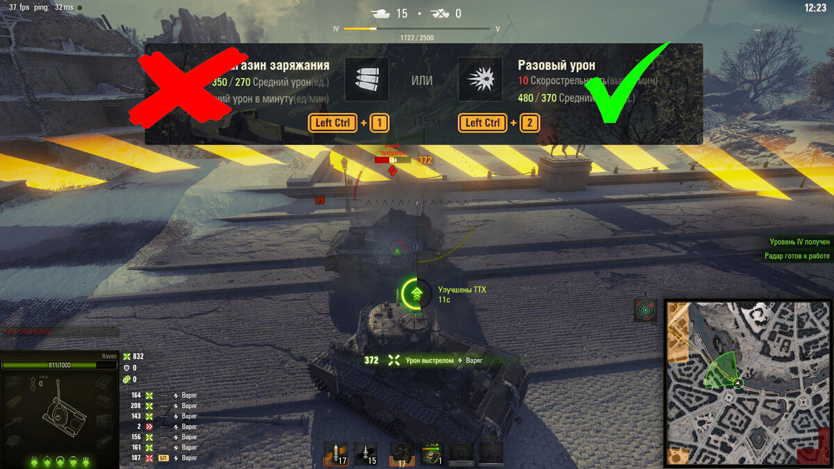 Стоит отметить, что абсолютно на всех танках в первых двух слотах нужно качать перезарядку радаров и максимальную скорость! Далее на Равене я беру корпус на мобильность, чтобы крутить противника, ставлю бронированную башню и беру пушку на разовый урон.