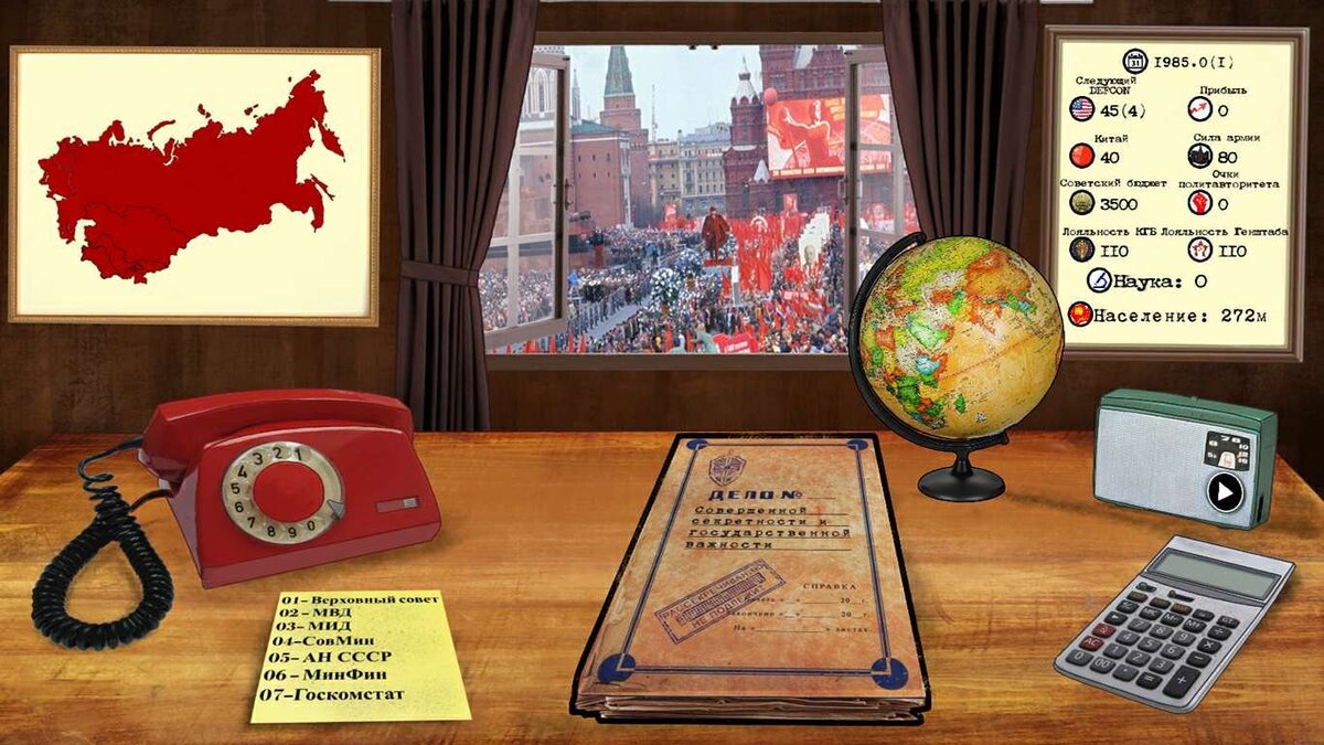 Эта игра была разработана еще в 1991 году, российской студией Kremlingames. В марте 2017 года она появилась на площадке Steam, но уже с современной графикой и новыми механиками. Crisis in the Kremlin обязательно должна понравиться всем россиянам, ведь население игры — это наши цифровые соотечественники. Геймеру предстоит примерить на себя роль главного секретаря КПСС. Ему нужно будет развивать словацкий союз, не дав ему распасться, как случилось в реальной жизни. Придется пережить все невзгоды величайшей страны. Кризис, натиск со стороны капиталистических стран, угрозы союзных республик выйти из состава СССР – это лишь малая часть проблем, которые предстоит преодолеть игроку. В начале игры можно выбрать одну из реально существующих политических партий 1985 года. Развитие событий будет значительно отличатся, при выборе разных партий. Ведь у каждой из них своя политика и формы правления. Также есть вариант создать свою собственную партию и задать ей любые параметры.