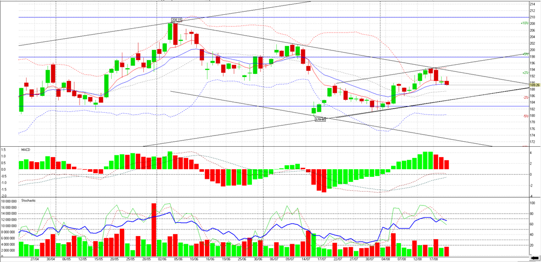 1. Объёмы. Объёмы низкие. 2. RSI. Линия пробила 70 и смотрит вниз. Продавать. 3. Stoсhastic. Обе линии пересекли вниз 80. Продавать. 4. MACD-Histogram. 3я красная свеча. Путь к экватору открыт. Продавать. 5. MACD. В покупке. Идут на сближение у экватора. Держать. 6. Bollinger Bands. Без пересмотра. Идём в широком канале. Держать. 7. Moving Avarage. Линии параллельны экватору. Держать. 8. Fibonacci retracement. Без пересмотра. Идём в широком канале 182,81-197,82. Держать. 9. Канал. Чёрный канал очень широкий. Верхняя линия 220. Зелёный восходящий низ 186,5. Нисходящий красный канал – очень некрасивый, низ 172. Держать. 10. Технический анализ. Перекрыли низы. Дорога вниз открыта. Уровень 192 выступает сильным сопротивлением. Держать. Новости. Нефть проторговывает 45. Зарубежные площадки демонстрирую лёгкую коррекцию. Все принимающие решения и ньюсмейкеры в отпуске. Рынок РФ ожидаемо корректируется вниз. Вывод. Уровень 192 выступил сильны сопротивлением для роста. Для его взятия необх