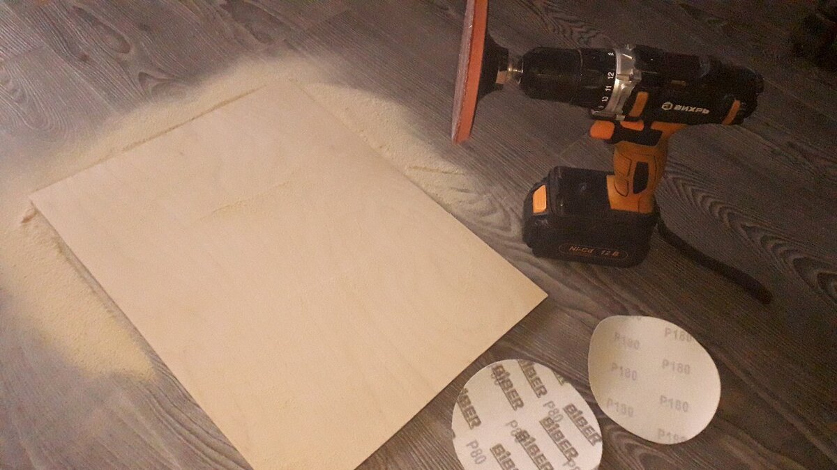 Сначала шлифуем фанеру. На момент изготовления данного портрета у меня еще не было ленточной шлифовальной машинки. А вручную шлифовка не получится достаточно качественной, либо придется натирать сво фанеру полгода.