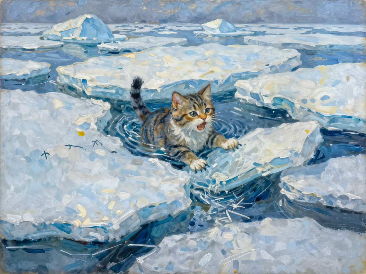 Страх и холод пронзили всё тело. Шерстка мгновенно намокла, став тяжёлой и неприятной. Из последних сил я карабкался, впиваясь острыми коготками в скользкую поверхность льдины. Но она словно избегала меня, ускользая из‑под лап.