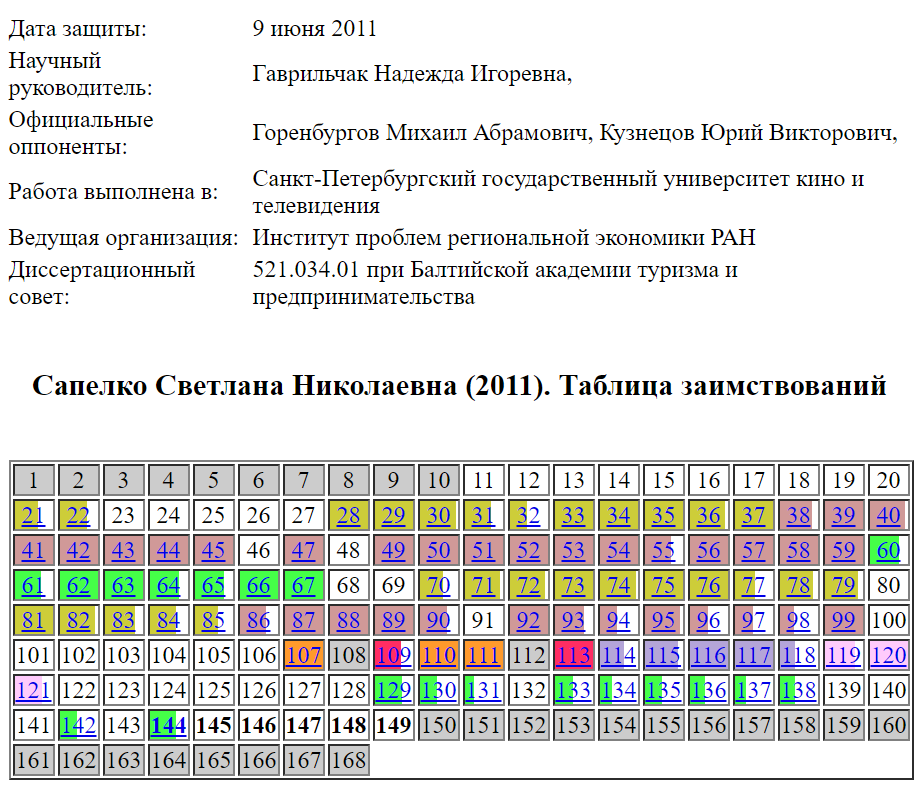 В библиографическом списке имеются записи о работах Гаврильчак Н.И., как единоличныъ, так и в соавторстве (№37-42 на стр. 155-156**), в том числе с соискателем (№148 на стр. 164**), статьях Арасланова Т.Н. (№16 на стр. 154**) и Лопатинской И.В. (№96 на стр. 160**). В тексте диссертации ссылки на статью Арасланова Т.Н. можно найти на стр. 110 и 112* (стр. под номерами 113 и 115 в диссертации), на статью Лопатинской И.В. – на стр. 121 (стр. под номером 124 в диссертации), что не соответствует объему тождественных материалов. Имя Гаврильчак Н.И. упоминается на стр. 5 введения среди исследователей, в трудах которых «теоретическая и методологическая база в отношении туристско-рекреационной деятельности достаточно детально проработана». Работы Семеновой З.А., Дмитриевой Н.В., Лихачева Р.В., Хашхожевой З.Х. не упоминаются ни в библиографическом списке, ни в в тексте диссертации.