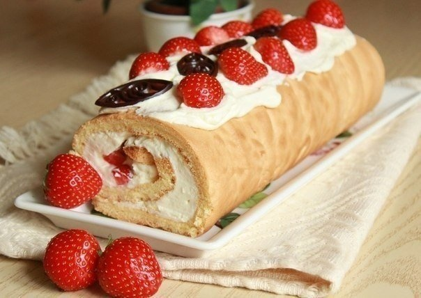 7. Аккуратно свернуть ещё горячий пласт в рулет вместе с полотенцем. Оставить остывать. Клубнику нарезать на небольши