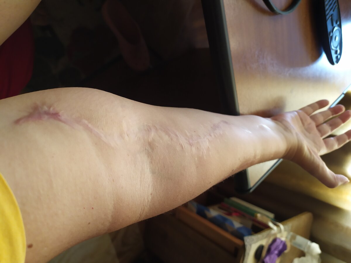 Очевидно, что без больничного я не могла обойтись после такой операции. Нагрузка на кисть была запрещена на 2 месяца. В течении 2-х недель нужно было очень осторожно разгибать локоть перегипсовывая каждый раз в других углах. На всякий случай сделали перегибы на старом гипсе и можно было рвать перегибы и если угол больше перегипсовывать. Нам повезло с доктором он был очень опытным и сильным каждый раз он мерил углы после такого как рвал перегиб и все удавалось без гипсования. Один минус приходилось очень долго ждать в очереди. Потом необходимо было начать восстановление: массаж, стимуляция, озокерит, итак по кругу. Центр восстановительного лечения как всегда помог, благодаря записке от травматологу директору центра у меня все было вне очереди. Там впервые назвали мой шов на руке "Это вас собака покусала" , "нет, крокодил". Сейчас я давно не стесняюсь своих швов, давно не обращаю внимание на людей, которые на него смотрят. Выглядит конечно жутвокато, тем более когда сейчас резали уже п