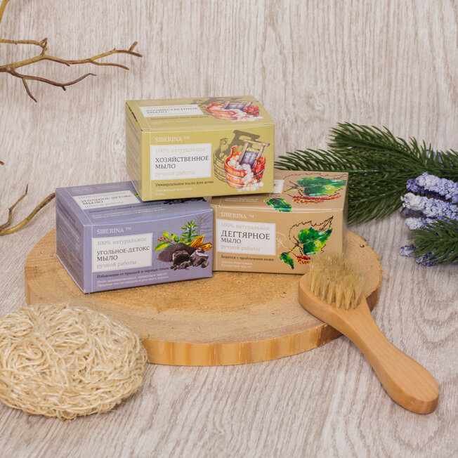 Первым продуктом в ассортименте SIBERINA стало как раз натуральное мыло с эфирными маслами – пригодился опыт нашего технолога. Мы разработали составы, приобрели сырье (кстати, все эфирные масла и экстракты мы закупаем напрямую из мест, где произрастают необходимые травы и растения). И вот в июне 2015 года свет увидели первые 11 видов мыла под брендом SIBERINA: «Кедровое», «Медовое», «Морское», «Облепиховое», «Кастильское», «Дегтярное», «Хозяйственное», «Роза», «Лекарственные травы», «Мыло-скраб» и «Мыло с черной глиной».