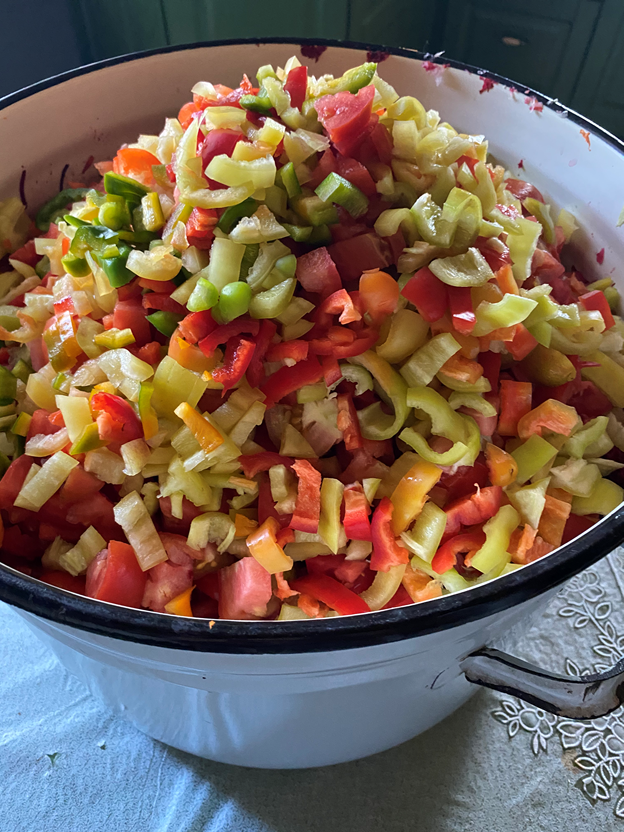 1. Самое трудоемкое – это вымыть и порезать все овощи. Нужна большая кастрюля, у нас в семье специально для этой цели хранится еще с советских времен 20-литровая. Если такой емкости нет, можно овощи собирать в разные емкости, они потом уменьшатся в объеме.