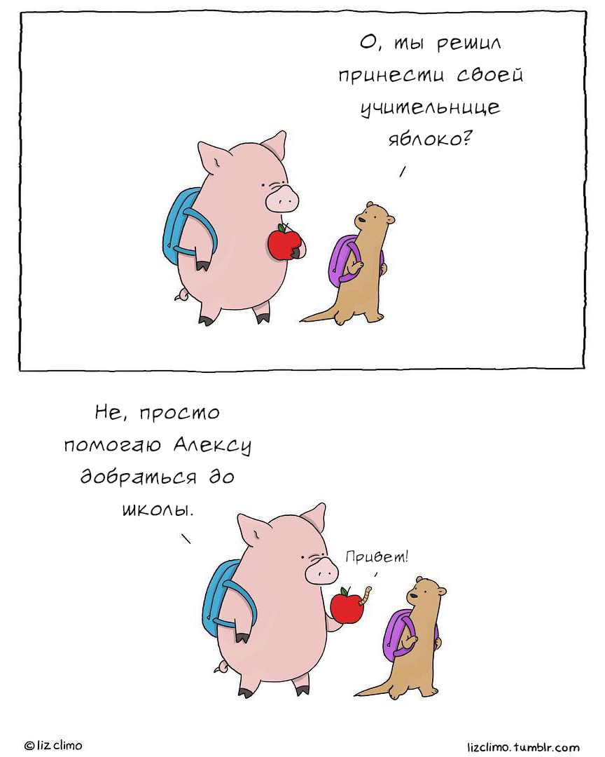 На 1 сентября принято дарить своим учителям подарки - чаще всего это букеты цветов, но встречаются и более оригинальные знаки внимания. Профессиональная американская художница Liz Climo в одном из своих милых комиксов о животных как раз отразила эту традицию.