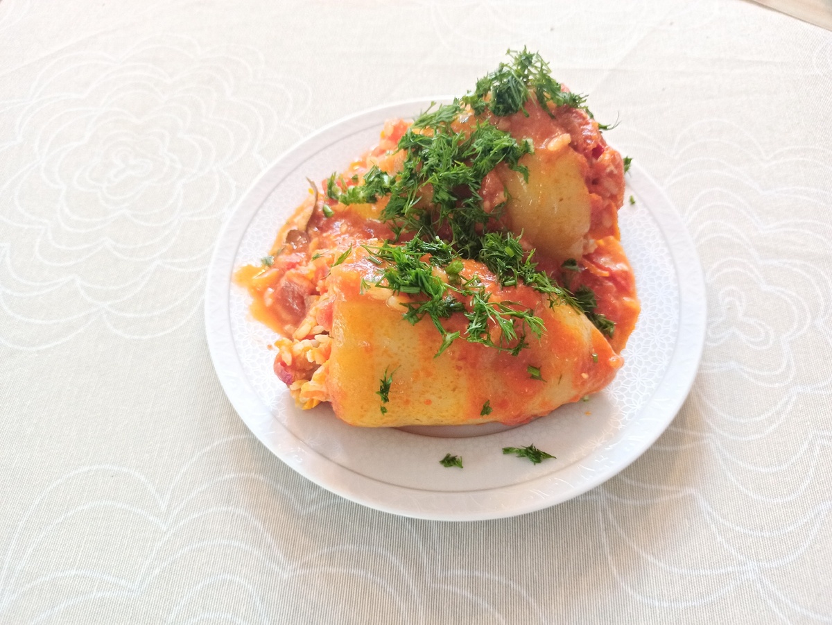 Все мы прекрасно знаем и любим фаршированные перчики. Но в этом рецепте в начинку вместо мяса я кладу баклажаны. Получается вкусно, как с грибами. Есть ещё одна изюминка, но всё по порядку. Баклажаны очищаю от кожуры и мелко режу. Одну луковицу мелко нарезаю, измельчаю одну небольшую морковь на крупной тёрке. Все подготовленные овощи раскладываю по отдельным тарелкам, так их удобней добавлять для обжарки. Теперь разогреваю сковороду с небольшим количеством растительного масла. Обжариваю лук, затем баклажаны и морковь обжариваю слегка. Солю, добавляю немного кориандра и смесь перцев. Сковороду снимаю с огня и даю немного остыть. Хорошо промываю длиннозёрный рис сорта басмати, сливаю воду и добавляю к баклажанам. Хочу заметить, что рис предварительно я не отвариваю и получается вкусно. Поджарку и рис я хорошо перемешиваю. Получился фарш. Перчики болгарские мою, срезаю верхушку вместе с плодоножкой, вычищаю внутри и вытряхиваю семечки. Заполняю перцы фаршем и укладываю в кастрюлю. Ставлю