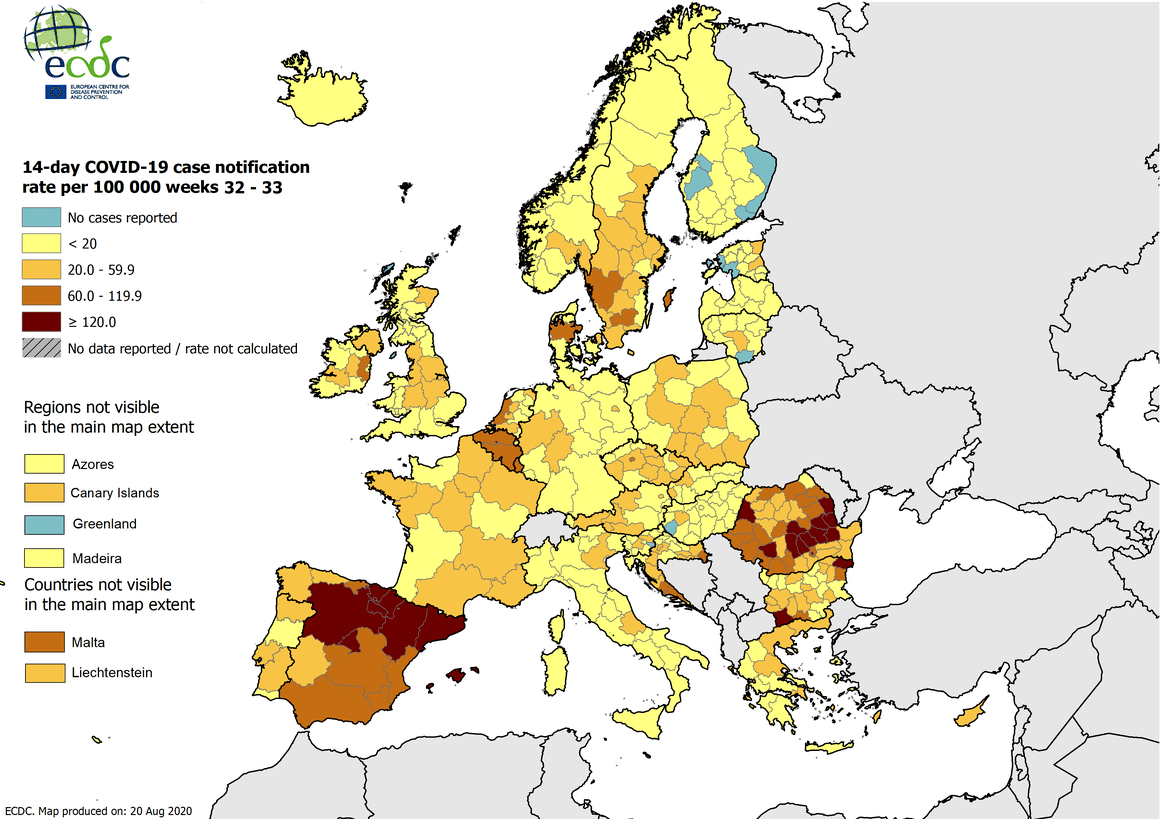 Направление считается рискованным, если за неделю на 100 тысяч жителей приходится более 50 новых случаев. В Испании эти показатели сильно выше. На карте ECDC доступны данные по всем регионам Европы:
