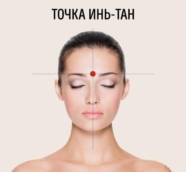 1. Точка третьего глаза, или инь-тан, находится между бровями, в том месте, где переносица переходит в лоб. Эта точка также отвечает за снятие усталости глаз