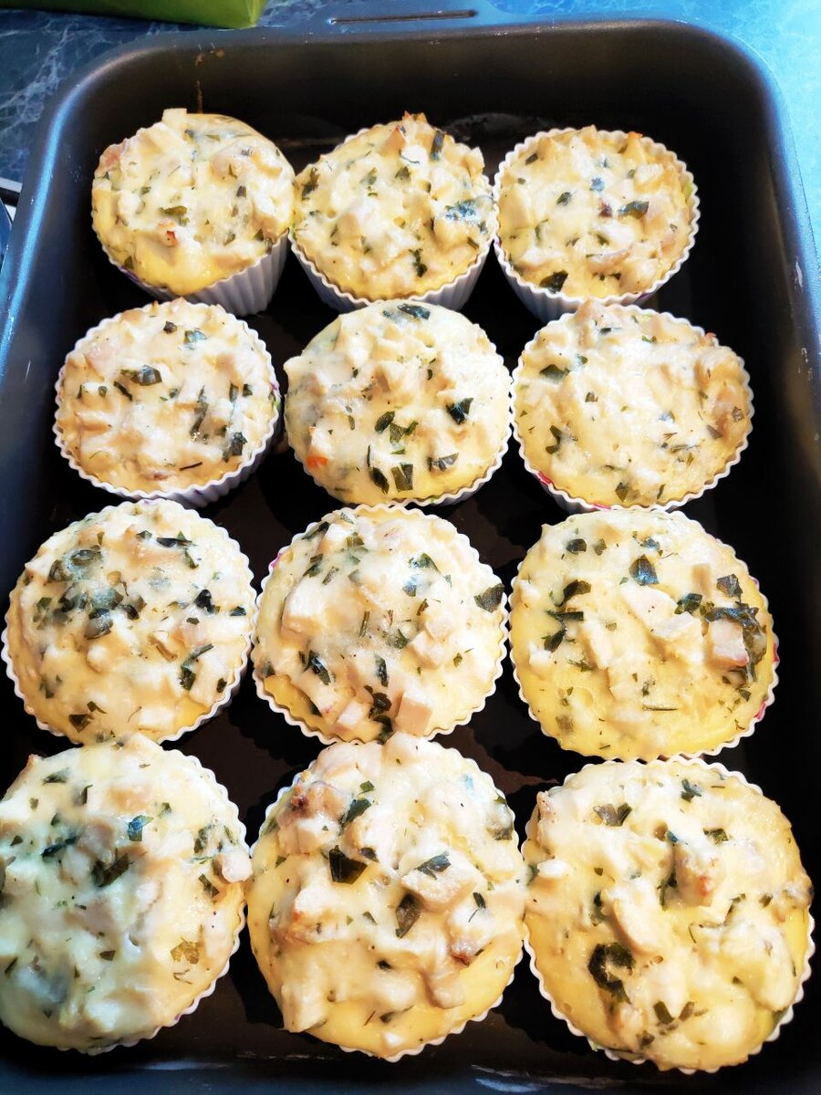 Смешать курицу, сыр, зелень, молоко, яйца, сметану, муку.