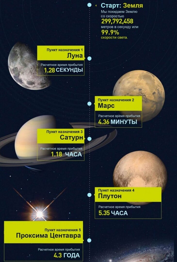 Сколько же нужно времени, чтобы долететь со скоростью света до различных космических объектов? Крутая инфографика!