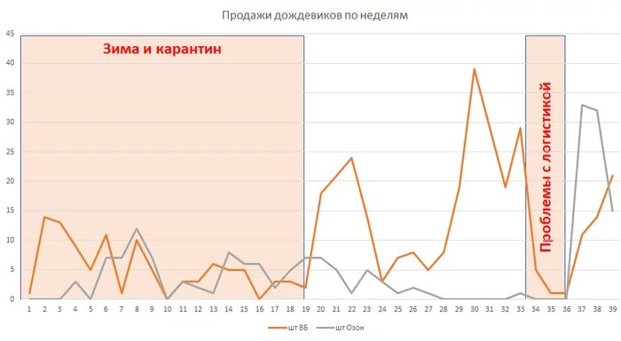 Intro В прошлом году я решил протестить, что такое "Бизнес с Китаем": заказал и импортировал партию дождевиков, выставил на OZON и WB, начал продажи. В Июле отбил все вложенные деньги и вышел в +100к прибыли. Сейчас я готовлюсь заказывать вторую партию дождевиков и, в идеале, хочу найти производителей в России, правда чисто из патриотических чувств. Второе дыхание В тот момент, когда я уже готов был похоронить идею все поменялось. Почти сразу после последнего поста в Мае продажи неожиданно пошли вверх. Буквально за 5 недель у нас выбрали весь запас дождевиков на Wildberries. На OZON их было мало и тоже все выбрали. Потом почти месяц из-за режима изоляции мы не могли доставить новую партию на склад и продажи стояли. Но самое главное за это время мы прошли контрольную точку – я вернул все вложенные деньги. Когда я понял, что в плюсе, ощущения были примерно как у Расса Ханнемана (Смотреть с 1:30) 😀 Оборачиваемость Продажи начались 39 недель назад, но реально активный период продаж соста