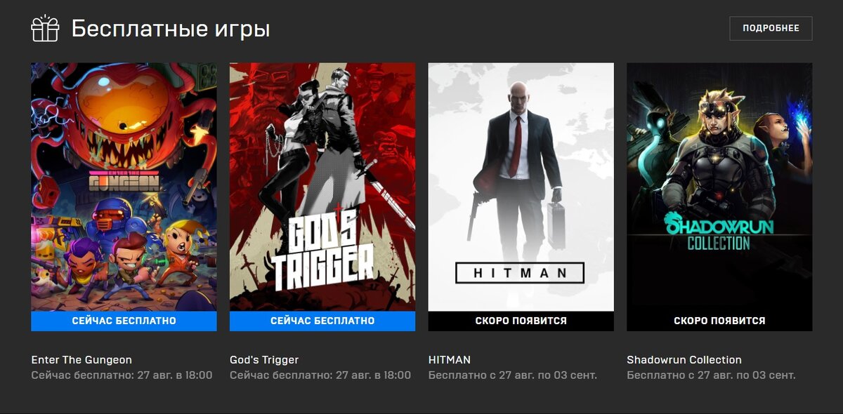 Epic Games Store начал бесплатную раздачу рогалика Enter the Gungeon и слэшера с видом сверху God's Trigger. В Steam игры имеют рейтинг 96% и 77% соответственно. Акция продлится до 18:00 по МСК 27 августа, а затем EGS предложит пользователям получить в свою библиотеку игры Hitman и Shadowrun Collection.