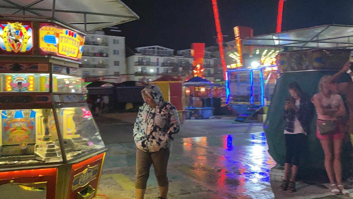 Люди идут обычно в эту сторону после 12-1 Часа ночи, но сейчас все также после дождя 8:10 вечера. Заката не было, потемнело из-за туч рано и быстро. Но вверху то видео реально показывает настоящую обычную жизнь в августе на курорте.