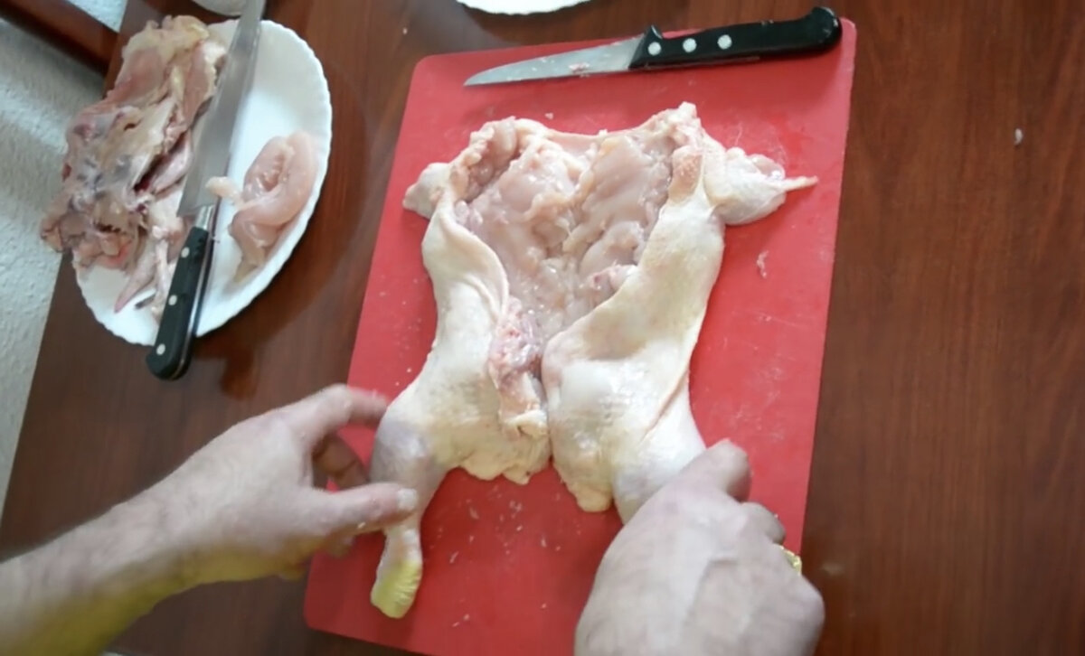 Разделка курицы от костей для фаршировки. Начинка может быть любая: рис с грибами или гречка с овощами и т.д. Всем привет! Сегодня мы будем разделывать курицу для фаршировки. Сначала убираем всё лишнее: сгибаем крылышки по суставам и отрезаем. Дальше обрезаем у курицы гузку. Но кому нравится – можете оставить. Теперь кладём курицу на брюшко и по линии позвоночника надрезаем шкурку – нам надо добраться до суставов крыла. Аккуратно отворачиваем шкурку и находим предплечье. Выворачиваем, подрезаем по суставу, освобождаем от сухожилий. Затем берём за косточку и счищаем ножом мякоть – одно крылышко у нас готово. То же делаем и со вторым, как можно ближе срезая мясо с косточки. Дальше отделяем спинку курицы. Для этого по линии разреза шкурки немного подрезаем мякоть и освобождаем суставы, соединяющие окорочка с хребтом. Надламываем хрящики и вытаскиваем хребет. Мне проще это делать руками, но можно помогать себе ножом. Если вместе с костями отделились какие-то кусочки мяса, можно его среза