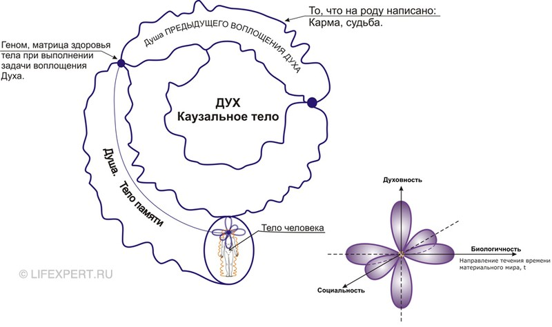 Энергетическая субстанция, которая перерождается, называется душой, а простыми словами говоря — Божественной искрой. Эти искры в своё время высекала Вселенная, как на конвейере. Однако как бы то ни было, душа человека является высшим энергетическим существом, истинным «Я», голос которого почти не слышен в ритме современной жизни и шума от неё. Чтобы понять, что это такое реинкарнация, необходимо представить следующую модель: