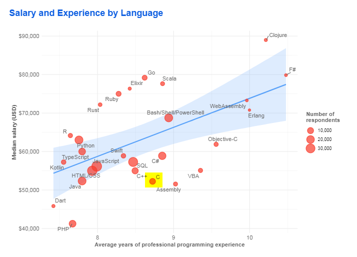 Средняя зарплата разработчиков в зависимости от опыта работыЭто один из самых прорывных языков, который сменил популярный в 1990-х C++. С тех пор он уступил долю рынка более современным языкам. К тому же из-за громоздкости язык не совсем подходит для индустрии облачных технологий, но он остается крайне востребованным как язык приложений для бизнеса.