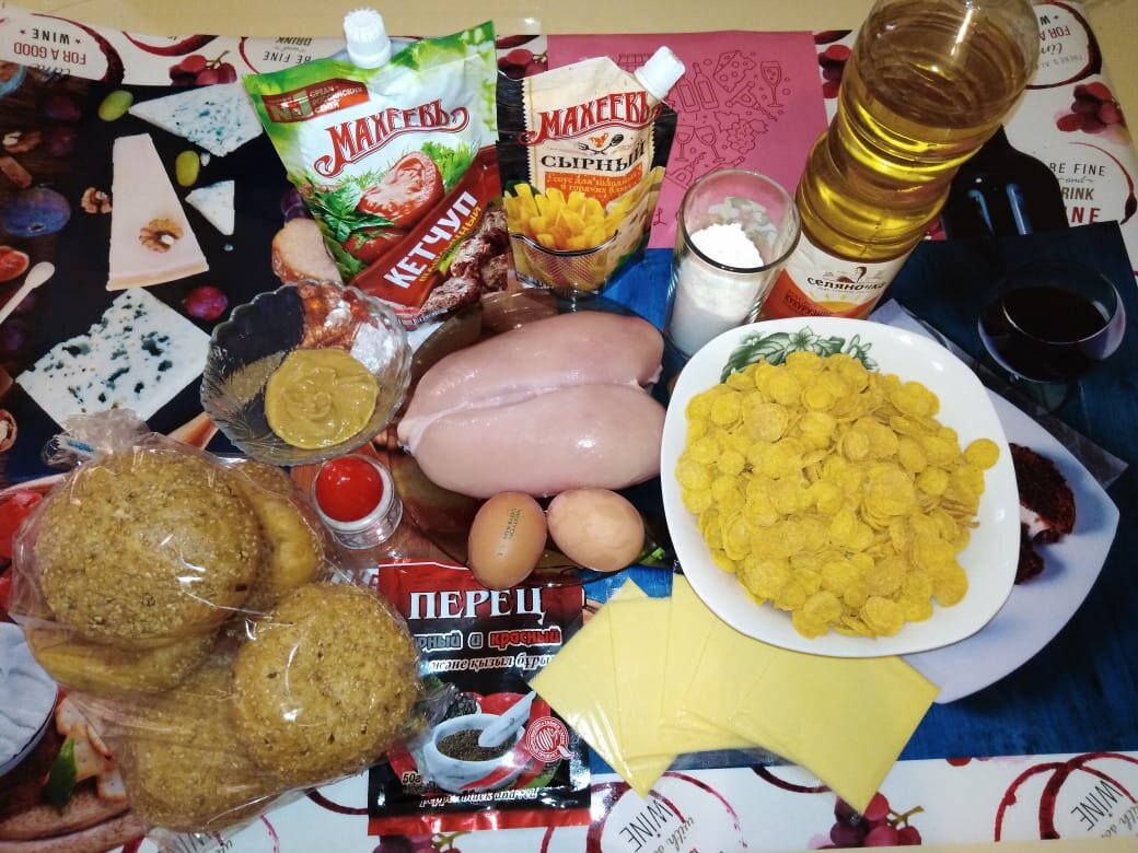 Недавно готовила стрипсы как в KFC, получилось очень вкусно, теперь муж захотел чикенбургеры, решила сделать, для этого тоже приготовила куриное филе в панировке, только в на этот раз в духовке Список продуктов: Куриную грудку помыла, обтерла бумажным полотенцем и убрала кости Про огурчик вспомнила потом, у меня был один, маленький, порезала его кружочками Куриное филе нарезала на небольшие кусочки и слегка отбила с одной стороны Посолила Добавила красный и черный перцы, перемешала и убрала в холодильник мариноваться на 1 час Кукурузные хлопья измельчила в блендере Яйца разбила в миску, добавила щепотку соли и взболтала венчиком Муку высыпала в не глубокую тарелку Каждый кусочек обваляла в муке Затем промокнула в яйце Обваляла в кукурузной панировке И выложила на смазанный маслом противень, отправила в разогретую духовку до 200 градусов на 25 минут, но через 10 минут достала и перевернула стрипсы на другую сторону, затем отправила опят в духовку на 15 минут Филе в кукурузной панировке