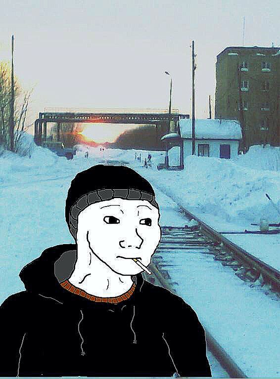 Впрочем, отечественный думер - это не только архетип, но и банальный мем из интернета. Даже всесильный Интернет не знает, кто придумал этого парня с грустными глазами в нелепой шапке, непрерывно курящего сигарету. Чтобы максимально раскрыть депрессивность персонажа, "думербоя"накладывают на низкокачественные фотографии российской глубинки, предпочтительно с зимними пейзажами и тающим закатом на фоне. Такую же нехитрую картинку сделал и я для этой статьи, используя фотографию родного двора.