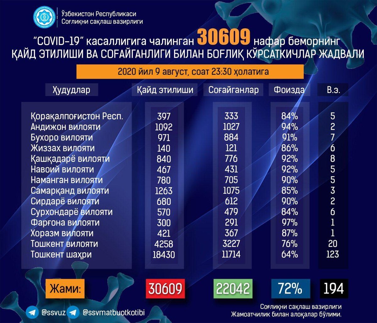 Узбекистан, Ташкент – АН Podrobno.uz. В Узбекистане за сутки, с 8 по 9 августа, выявлен 691 больной коронавирусом. По состоянию на 9 августа на 23:30 число случаев заражения коронавирусной инфекцией достигло 30609, сообщает корреспондент Podrobno.uz со ссылкой на Минздрав. "От коронавируса скончались 6 человек, из которых 3 – в Ташкенте, по 1 – в Кашкадарьинской, Ташкентской и Навоийской областях. Всего за время пандемии умерли 194 человека", – отметили в министерстве.