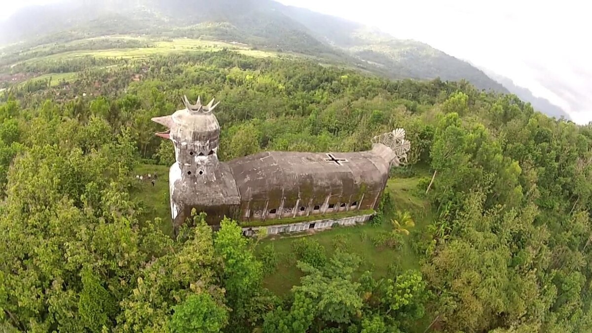 Одно из самых удивительных и странных зданий в мире: Недостроенная Куриная Церковь (‘Gereja Ayam’ или ‘Chicken Church’). Находится она на индонезийском острове Ява. Это необычное здание было построено в 1990 году 67-летним Даниэлем Аламсжахом возле города Магеланг. Как утверждал мужчина, к нему пришло «божье откровение», и после этого он приступил к возведению этой постройки. Даниэль не позиционировал это здание как церковь. Это было молитвенным Домом, куда мог прийти любой желающий, независимо от вероисповедания, и обратиться в Всевышнему. Мужчина строил Дом в виде голубя, но местные жители окрестили его Gereja Ayam, что значит «Куриный дом». И правда больше на курицу похоже. Помимо своего прямого назначения, молитвенный Дом использовался также в качестве реабилитационного центра для детей-инвалидов и наркоманов. В подземной части здания есть 12 недостроенных комнат, где они содержались. К 2000 году «Куриную церковь» пришлось закрыть из-за нехватки средств на ее содержание и дальней