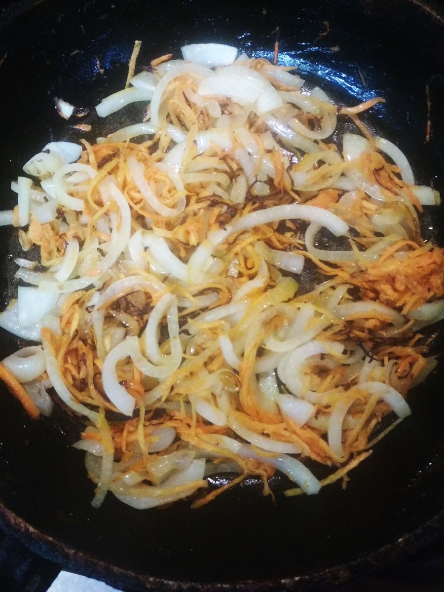 Для начала чистим морковь и луковицу. Лук нарезаем полукольцами, а морковь трем на мелкой терке. В разогретой сковороде на растительном масле жарим лук до прозрачности, а затем закидываем к нему морковь.