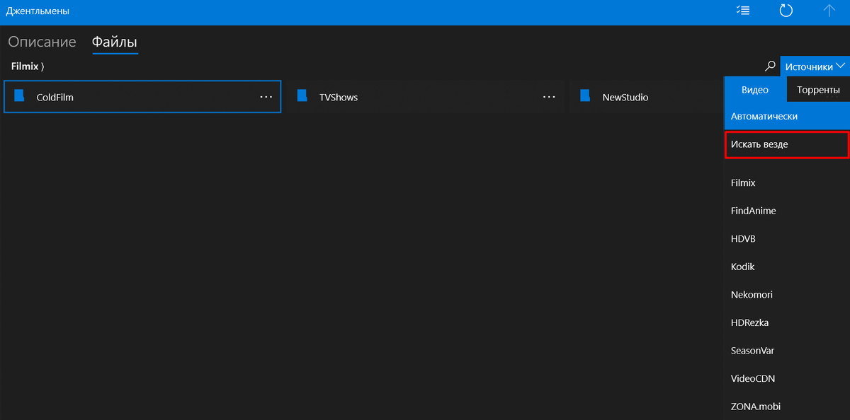 Основной источник (выставлен в параметрах) сейчас "Кинориум" (вторая картинка), но при выборе конкретного фильма можно выставить поиск по всем источникам (третья картинка), смотрите галерею ниже👇):