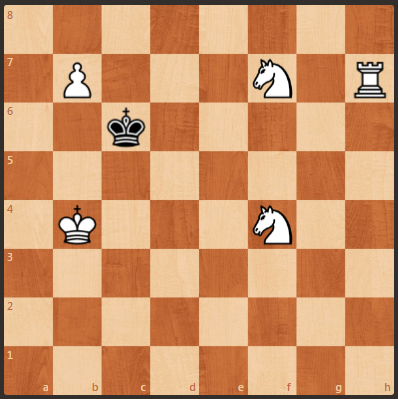 Автор Н. Бакке, 1972 год. У белых в распоряжении: два коня, ладья и пешка. Белые начинают и ставят мат в 2 хода.