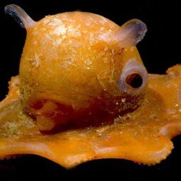 Название Dumbo octopus дано существу в честь Диснеевского ушастого слоненка по имени Дамбо. Причиной стало наличие плавников, напоминающих уши. По-научному осьминог называется Grimpoteuthis. Насчитывается примерно 37 видов этих осьминогов. Живут они в каждом океане мира. Полюбоваться ими получается не у всех: обитают они, в основном, очень глубоко, в 3-4 тысячах метров от поверхности воды. О Дамбо (или Думбо) известно не много, но считается, что им грозит исчезновение. Размеры большинства взрослых представителей вида очень малы и не превышают 20 с небольшим сантиметров. Самым крупным зарегистрированным экземпляром стал 180-сантиметровый осьминог, весивший почти 6 кг. Существо имеет прекрасно приспособленное к глубоководному существованию тело. У него мягкая «голова» и 8 «рук», соединенных друг с другом кожей. С обеих сторон «головы» располагаются ушные ребра в количестве двух штук.  Самка и самец отличаются длиной присосок. У самцов они более длинные. Также осьминоги мужского п
