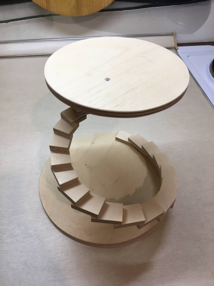 При склейке используйте самые маленькие струбцины какие найдутся в мастерской. Желательно сначала склеить спираль, потом ее приклеить к кругам по очереди, но я это понял уже после того как все приклеил. Примерно после середины нижней части спирали склейка становиться все более затруднительной, желательно примеряться "на сухую". Прижатие последнего, самого маленького элемента к кругу диаметром 150мм осуществляем с помощью маленького самореза. Для большей эстетичности (чего я не сделал), саморез лучше ввинчивать изнутри.