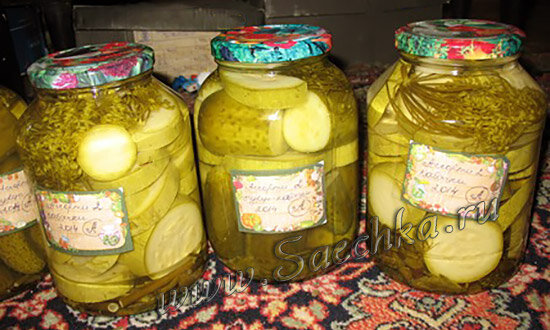 - Недостающее количество огурцов заложить до верха банки колечками кабачков.