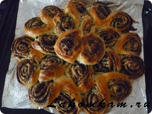 Мак проварить в воде, чуть размять и добавить сахар. Раскатать тесто толщиной 0,7 см. Выложить начинку, разровнять.