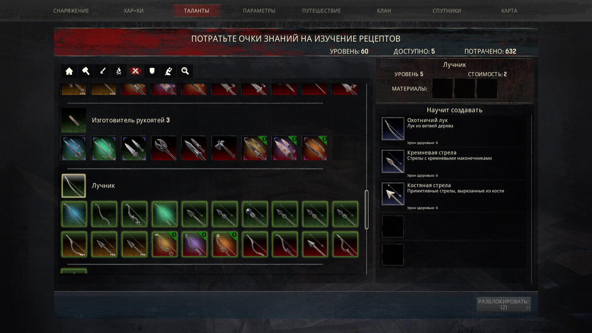 Луки конечно оружие хорошее и даже слишком, но без стрел, как не сложно догадаться, совершенно бесполезное. В этом гайде я подробно расскажу всё об обычных стрелах. О том какие они бывают и какую пользу могут принести. Итак, доступ к вашим первым стрелам вы сможете открыть на 5 уровне вместе с талантом Лучник. Он даст вам доступ к первому, Деревянному Луку и двум видам стрел: Костяной и Кремниевой. Обе имеют одинаковый урон в 6 единиц и пробитие брони в 16,2%. Разница между ними заключается в ресурсах необходимых для изготовления. Кремниевая делается из Камней и Веток. Костяная из Костей и Растительных Волокон. Оба вида стрел вы можете делать в инвентаре, а вот последующие стрелы изготавливать придется у плотника. На 20 уровне вам станут доступны Железные Стрелы. Они наносят 9 единиц урона, а броню пробивают на те же 16,2%. Эти стрелы уже более сложные в производстве, для их изготовления понадобятся: Ветки, Железные Слитки и Перья. 30 уровень откроет вам доступ к Стальным Стрелам. Ур