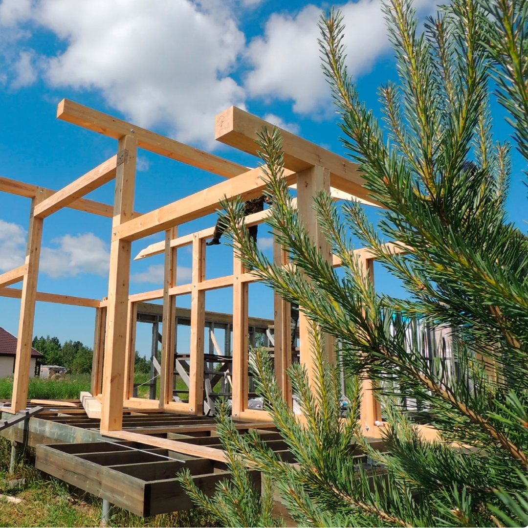 Предлагаю просто полюбоваться деревянным каркасом фахверкового дома. Конечно часть этого каркаса будет спрятано под утеплителем и обшивкой стен. Но балки на террасе и фасадной стене, ветровые затяжки на крыше и.т.д. будут сохранены открытыми и останутся, частью интерьера.