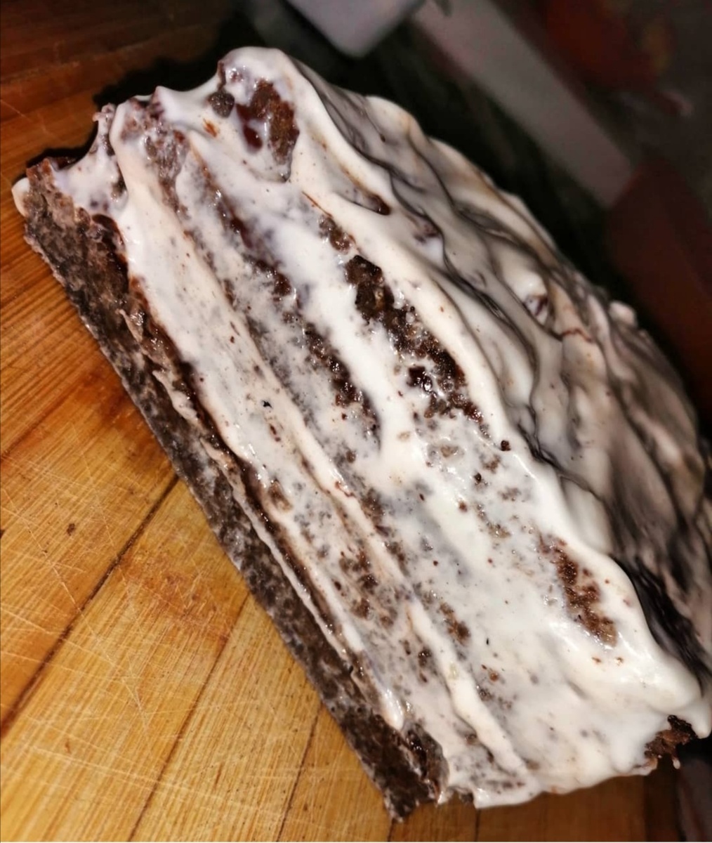 Ингредиенты: 🔹2 банана 🔹2 куриных яйца 🔹10гр оливкового масла 🔹120 гр овсянки (можно сразу овсянкой муки) 🔹1/2 ч.л. разрыхлителя 🔹40мл кефира 🔹Подсластилель по вкусу 🔹15гр какао 🔹50гр горького шоколада 🔹150гр мягкого детского творжка Приготовление: ◾Желтки отделить от белков ◾Нарезанные бананы, овсяные хлопья, желтки и кефир перемешать в блендере ◾Белки взбить до пенки. К ним добавить смесь из блендера, разрыхлитель, какао, масло. Все тщательно перемешать ложкой. ◾Залить тесто в силиконовую форму. Присыпать порубленым шоколадом. И отправить в духовку на 20 минут при 180° ◾Достаём корж. Разрезаем на 4 равные части ◾В творожок добавляем подсластилель. ◾Промазиваем каждую часть и складываем друг на друга. Промазываем обильно. И по бокам ◾По желанию, можно сверху присыпать тёртым шоколадом или ягодами. Это уже на ваше усмотрение. Я оставила просто творожок. ◾Готово! Ставим на пару часов в холодильник. А если оставить на ночь, то будет ещё лучше. ☝️Из этого состава получиться 1/