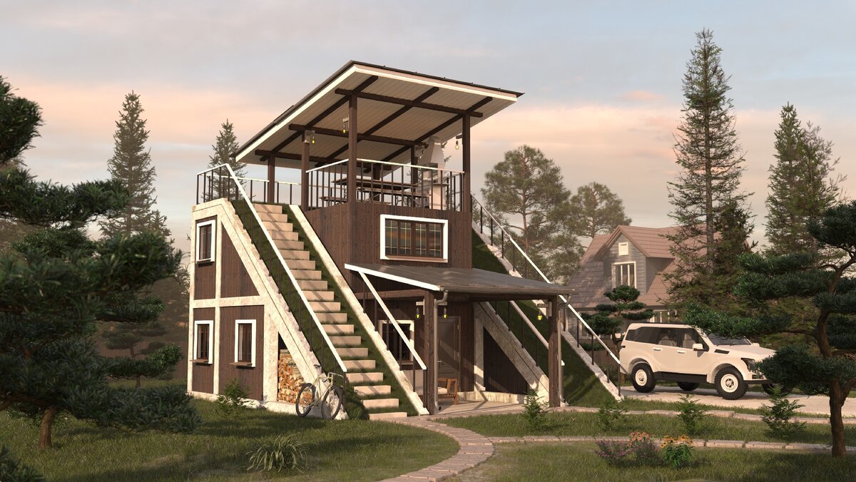 Проект компактного загородного дома для любителей активного отдыха с элементами эко стиля. Основа монолитный железобетонный скелет, стены пеноблоки и отделка деревом, беседка на 3 этажа так как с неё открывается шикарный вид. Размер 8х8
