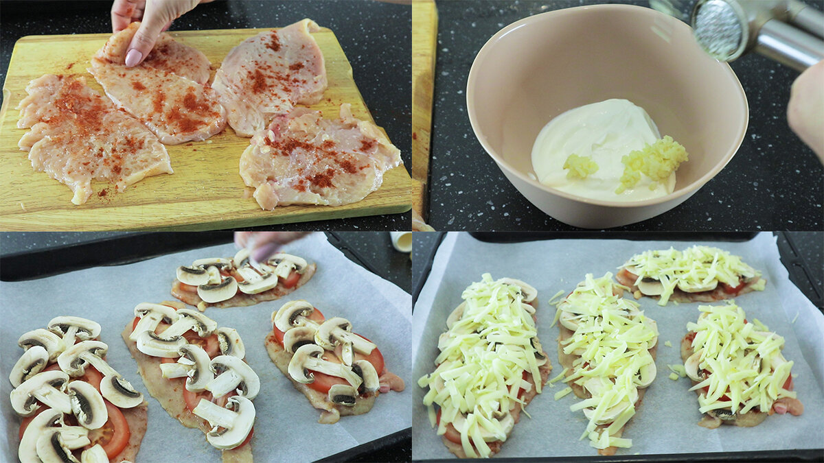 1. Куриные отбивные с помидорами и грибами: