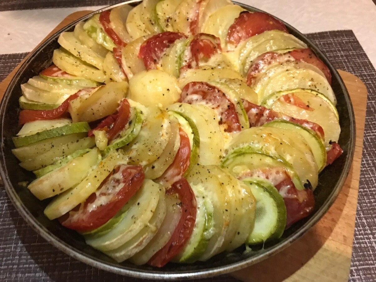 Сверху выкладываем кружочки картофеля, кабачка и помидора, чередуя их между собой. Солим и перчим овощи.