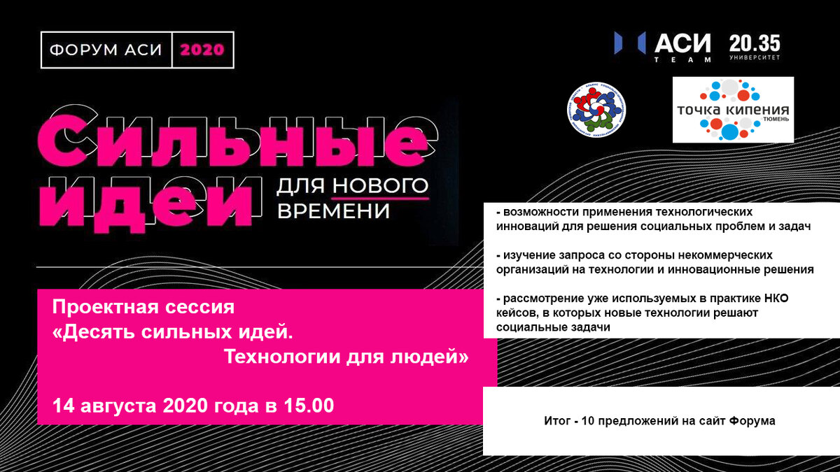 Альянс социально ориентированных некоммерческих организаций Тюменской области объявляет о проведении в ближайшую пятницу, 14 августа 2020 года, проектной сессии для лидеров и активистов некоммерческого сектора «Десять сильных идей – технологии для людей». Партнерами сессии стали Торгово-промышленная палата Тюменской области, экспертный клуб «Урал – Евразия» и департамент развития общественных инициатив Общероссийского Народного Фронта. В мероприятии, призванном активизировать работу регионального общественного сектора по подготовке предложений к организуемому Агентством стратегических инициатив Форуму «Сильные идеи для нового времени», примут участие представители более 40 ведущих НКО Тюменской области. Экспертом проектной сессии станет ведущий инженер по автоматизации технологических процессов Евгений Васильевич Шадрин. Модератором выступит председатель Альянса СО НКО Тюменской области Михаил Михайлович Мельцер. Уже сейчас в плане работы сессии находится рассмотрение проектов по игр