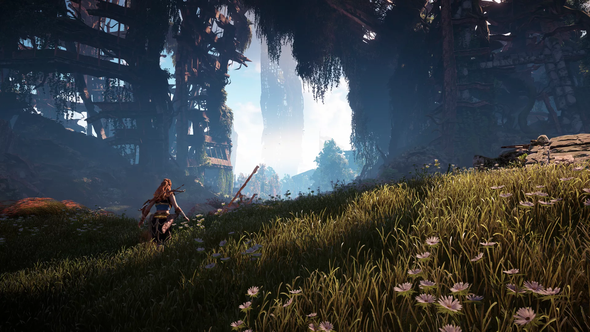 Однажды Элой падает в пещеру. Где набредает на останки былой цивилизации - котоаря давно разложилась на плесень и липовый мёд. То находит абсолютно исправную гарнитурку в ухо со встроенным мега-компьютером, проектором и батарейкой с бесконечным электричеством. Которая дет ей AR-интерфейс для "улучшения пользовательского опыта". Она стала видеть сквозь стены. Лучше стрелять. Управлять удаленно виртуальной трихомудией, выстраивать треки перемещений железных животных и прочее.