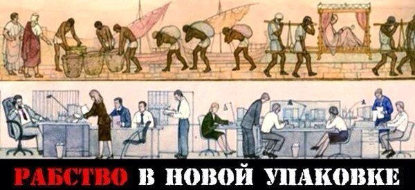 Современный раб вынужден работать без остановки до смерти, так как средств, заработанных за 1 месяц, хватает, чтобы оплатить жилье за 1 месяц, еду за 1 месяц и проезд за 1 месяц. Поскольку денег хватает всегда только на 1 месяц, человек вынужден работать всю жизнь до смерти. Пенсия также является большой фикцией, так как раб-пенсионер отдает всю пенсию за жилье,еду и лекарства, и у раба-пенсионера не остается свободных денег.