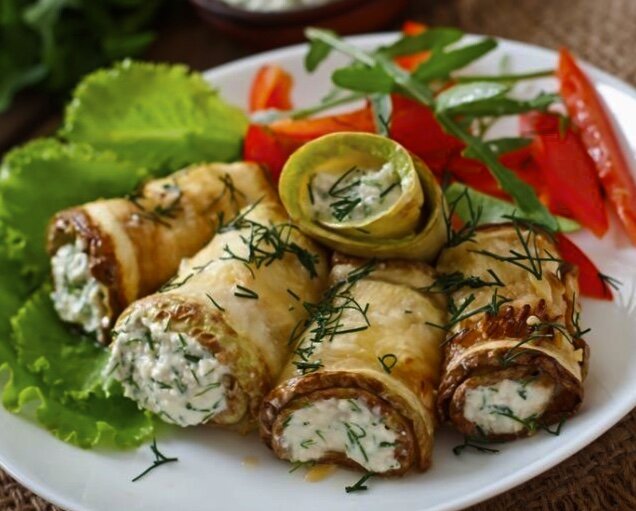 За это время кабачки дойдут до нужного состояния, и с ними можно будет работать. Немного остудить ломтики кабачков, разложить их по рабочей поверхности. На каждый ломтик сверху положить начинку и скрутить рулетик.