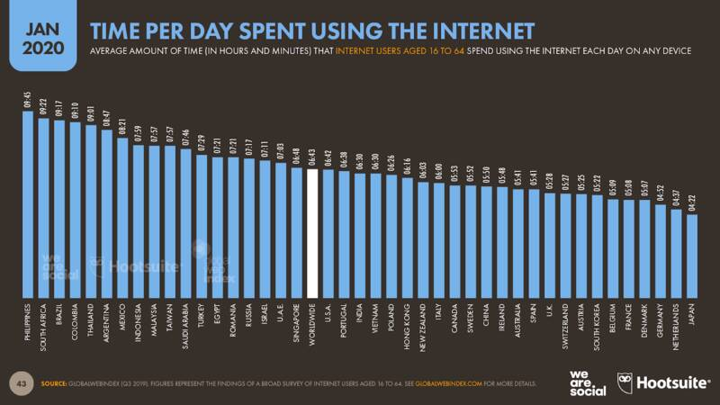 Сколько времени в среднем проводят пользователи разных стран в интернете. Источник: We Are Social’s Digital 2020 report