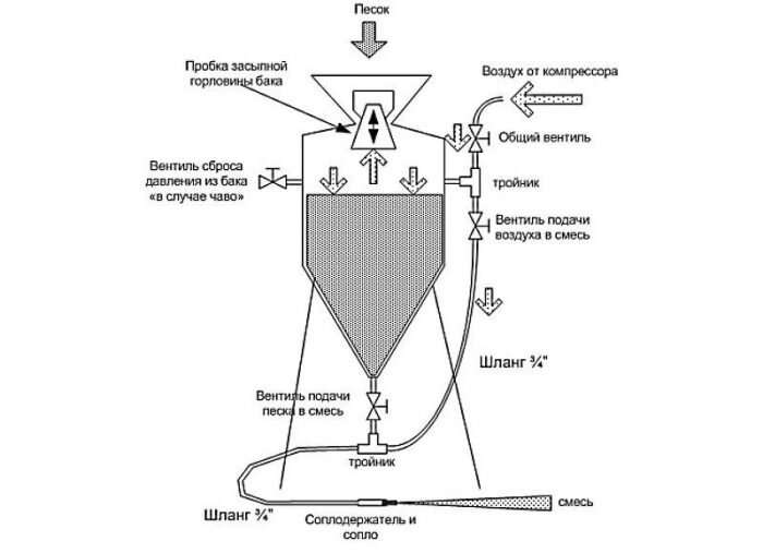 Есть 2 схемы, на базе которых собирают самодельные пескоструи, — напорная и эжекторная. Их отличие — способ подачи абразива на обрабатываемую поверхность. Однако набор необходимых элементов для этих конструкций практически одинаков. Помимо компрессора, нагнетающего воздух, в него входит: