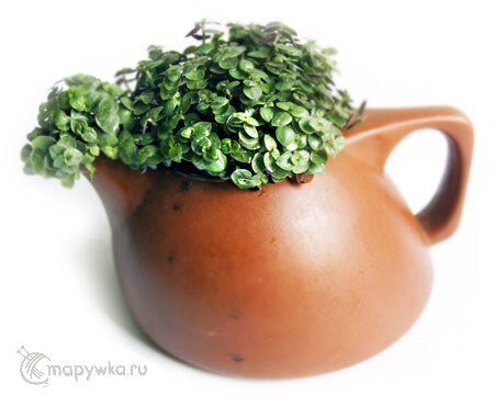 Заварив, славящийся своей способностью прояснять мысли кудин (если кто не знает, это не совсем зеленый чай, а листья падуба, скрученные в "иглы" и удивительно горькие), я начала размещать специально припасенные растения по чайникам. Конечно, в них можно посадить все, что угодно. Но особенно хорошо смотрятся ползущие и свисающие растения. Их можно посеять самостоятельно и терпеливо ждать всходов, а можно использовать готовую рассаду декоративных растений, купленную в магазине.
